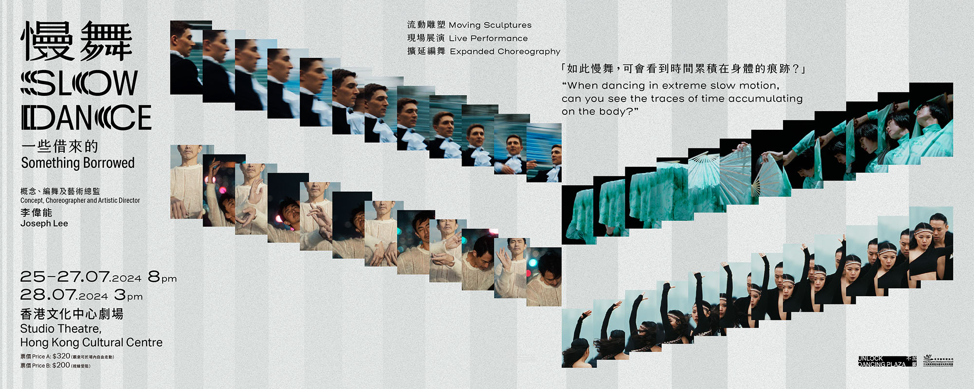 Slow Dance: Something Borrowed is the first theatre work in the "Slow Dance" series created by Joseph Lee, artistic director and choreographer of Unlock Dancing Plaza. The "Slow Dance" series originated from his exploration of the reception and presentation of different dance genres. He aims to subvert the speed and temporality of some original dance forms, extending and transcending the rhythmic and coherent dynamics of traditional performances.